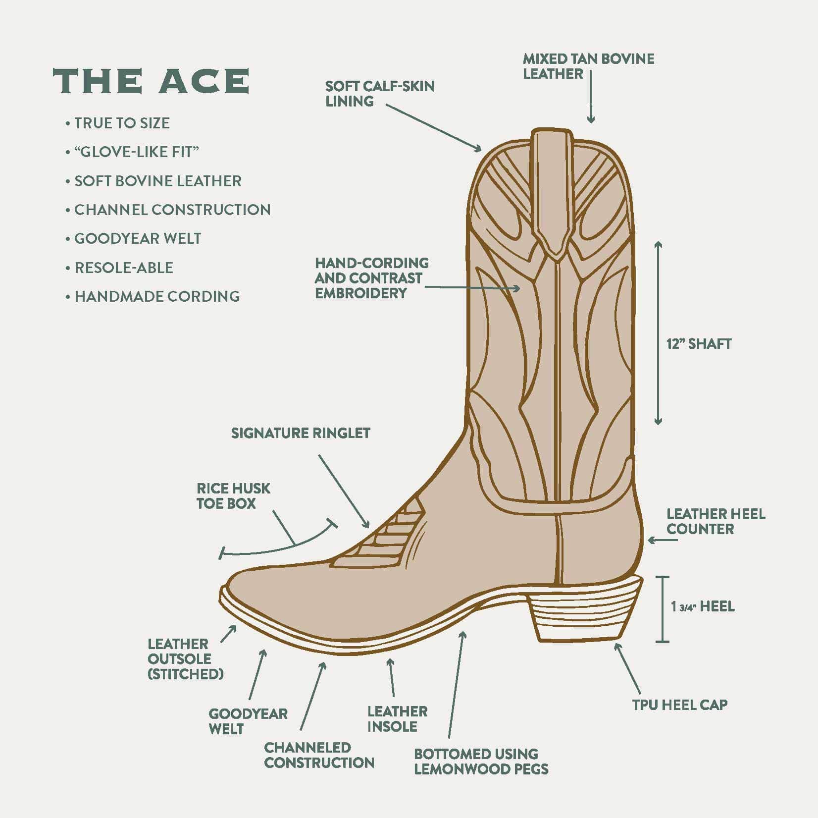 The handmade construction and classic leather sole make the Ace perfect for days in the saddle or out on the town.